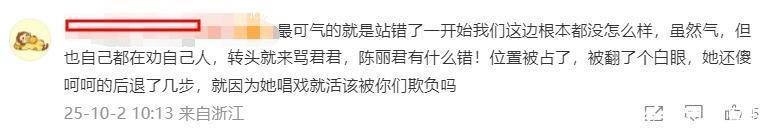 在这件事情中,陈丽君明明因为刘惜君的走位受到影响,她一句话也没说,结果被刘惜君的粉丝要求道歉,实在太魔幻。