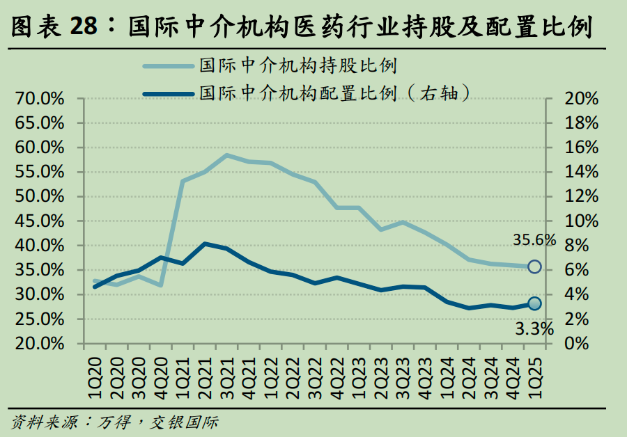 另据交银国际的统计,截至2025年1季度,国际中介机构持有医药股的比例处于历史低位。