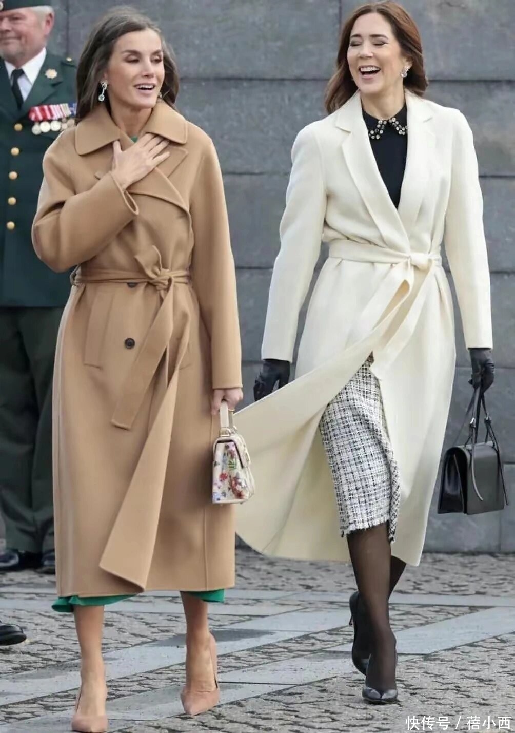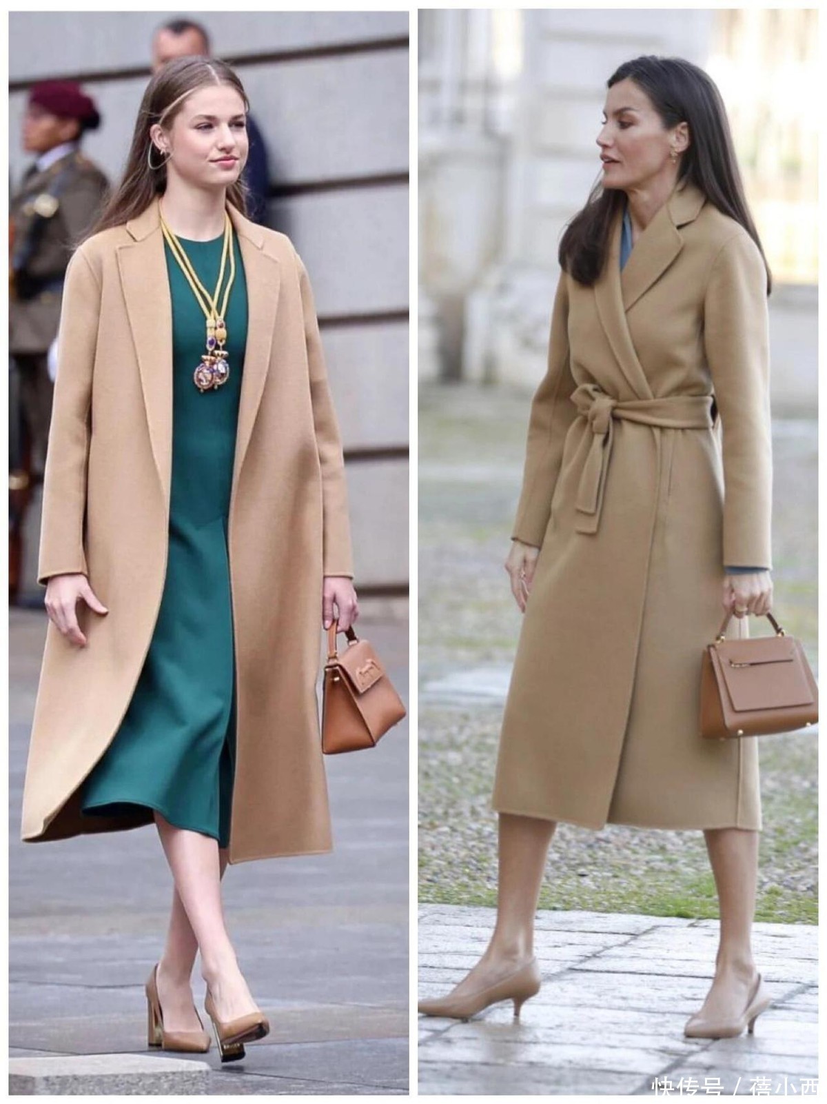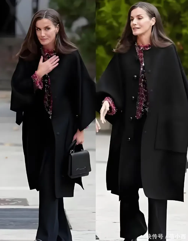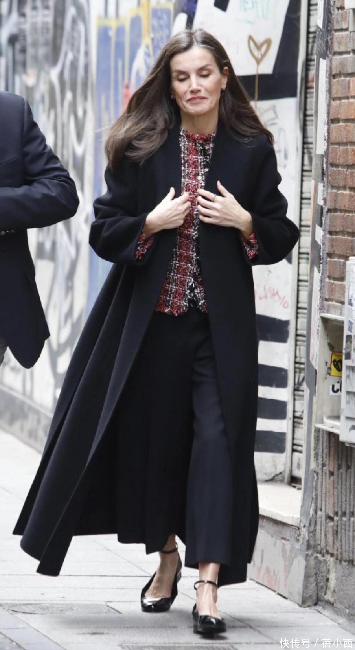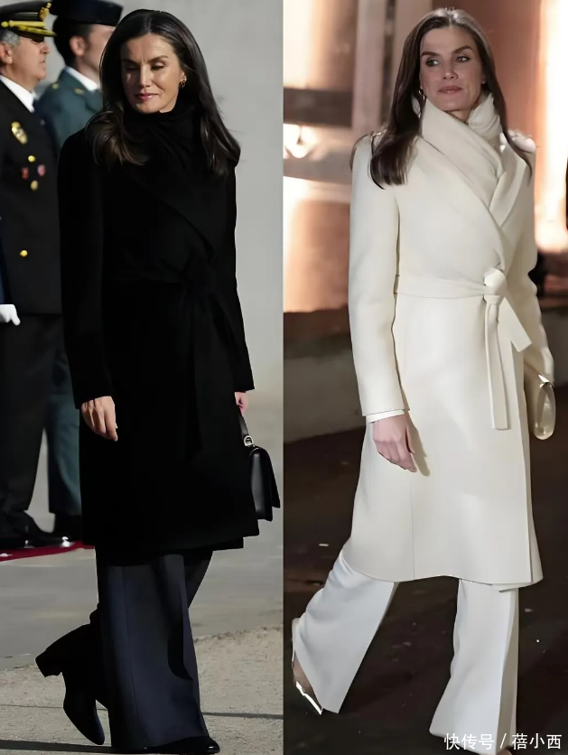 在穿大衣的时候,莱蒂齐亚从不用短裙博眼球,她的裙装永远精准落在膝盖下方5-10厘米处,既不拖沓也不暴露。直筒款、A字款是她的偏爱,面料多选用羊毛、真丝混纺等自带质感的材质,一看就很高级。