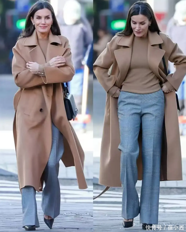 不配打底裤这一点最值得借鉴,也最能拉开穿搭档次,你看莱蒂齐亚的大衣搭配,几乎从不选厚重的黑色打底裤,这是因为打底裤会破坏整体穿搭的线条感,深色显笨重,肉色易显脏,反而拉低质感,显得俗气。