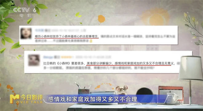 不少观众将《小山河》与日本电影《小森林》系列比较,指出前者放弃了后者的核心叙事理念——美食部分偏少,而感情戏和家庭戏却多而不合理,缺乏意义。