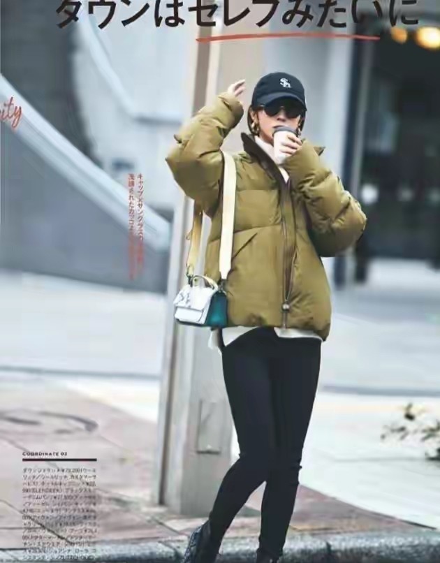 为了能够提升造型的品质,羽绒服面料采用的是亮面的材质,穿在身上看起来会更有品质,同时,要打破整体造型的沉闷感,还用了驼色的腋下包来点缀。