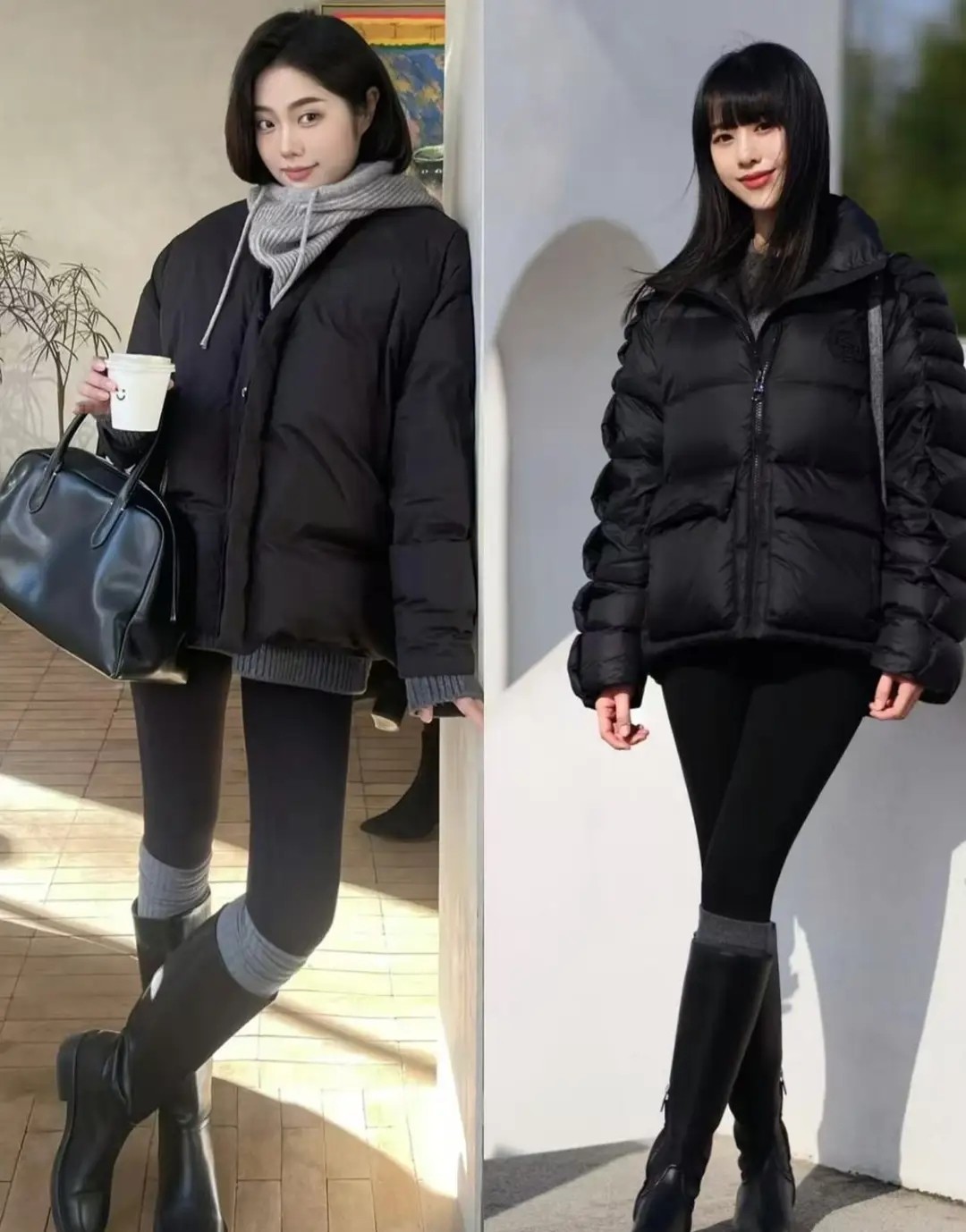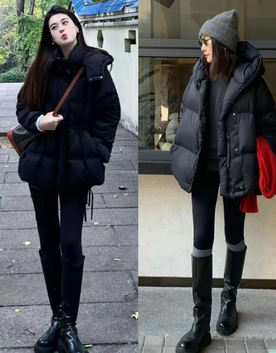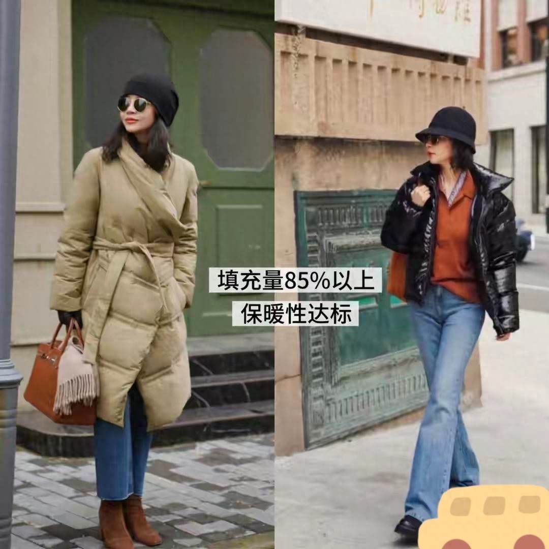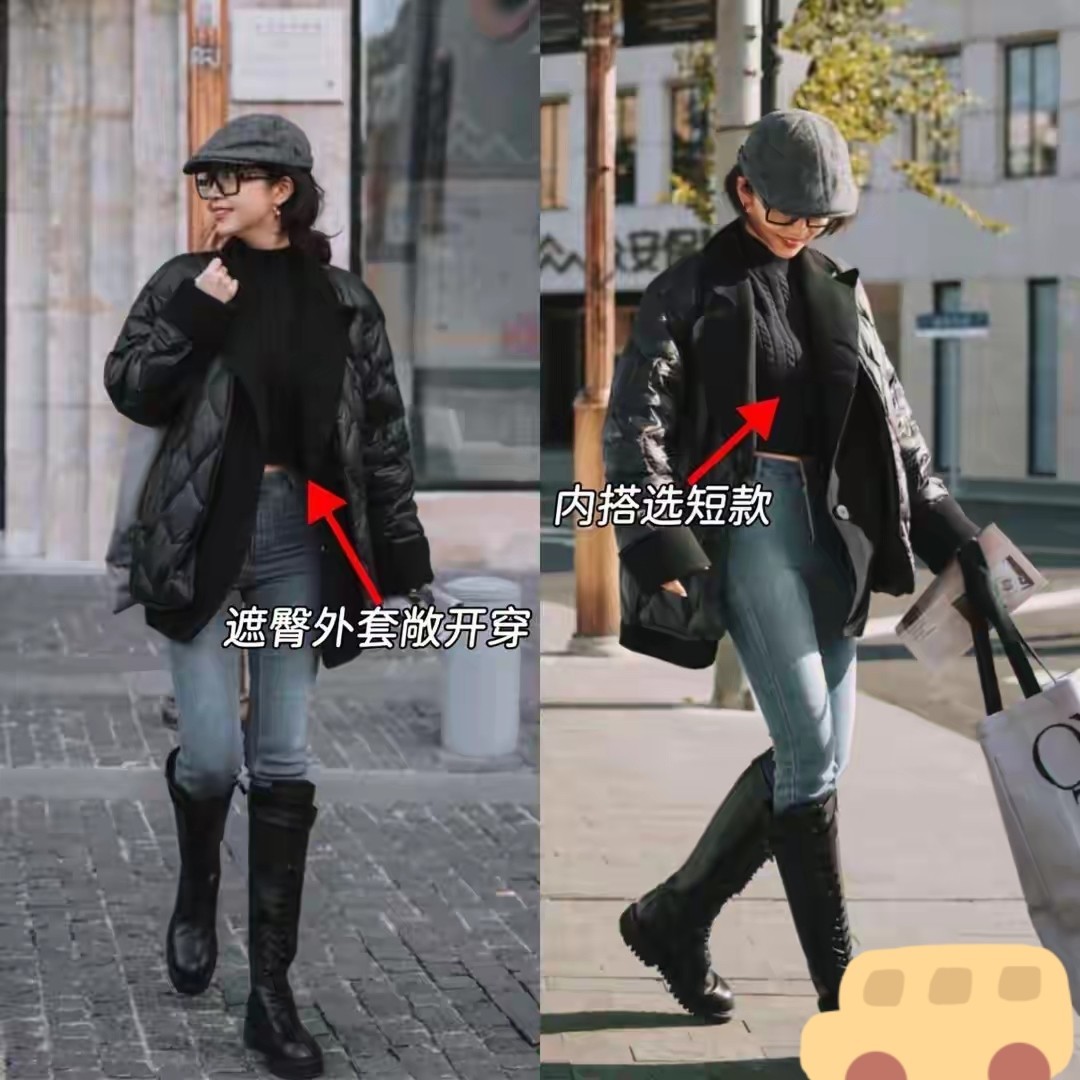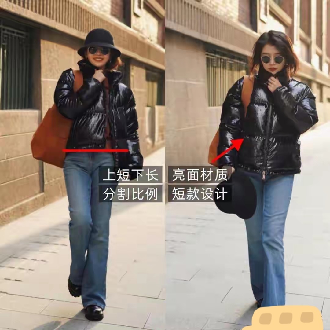 像下面右边这一件黑色羽绒服长度到膝盖的位置,整体效果就有点压身高。