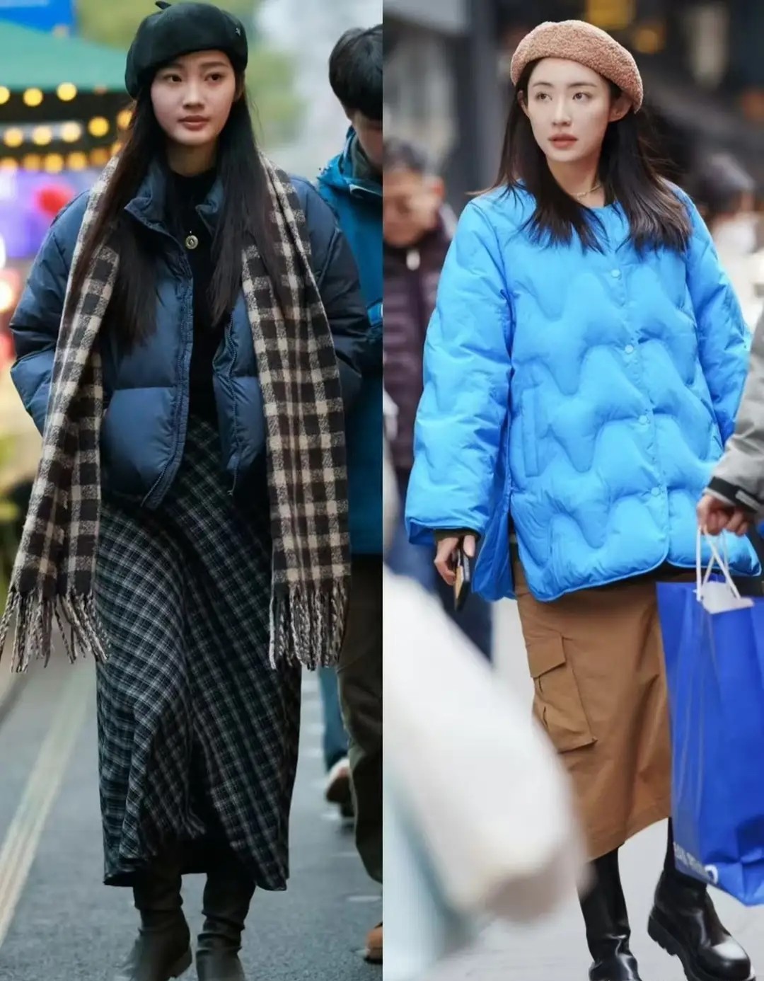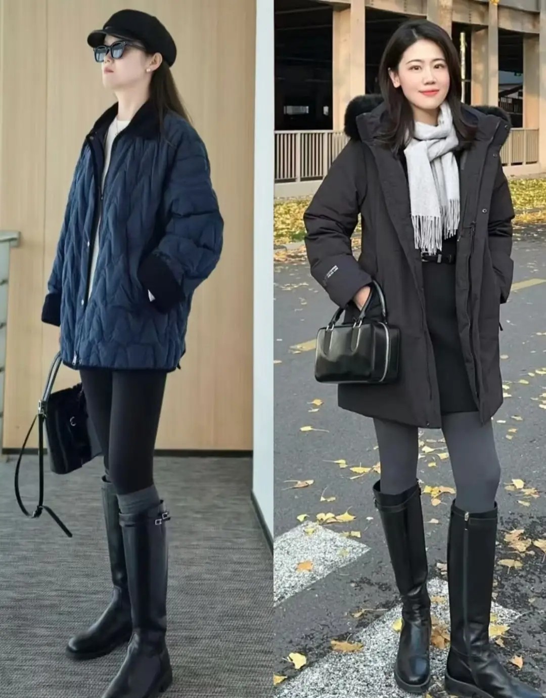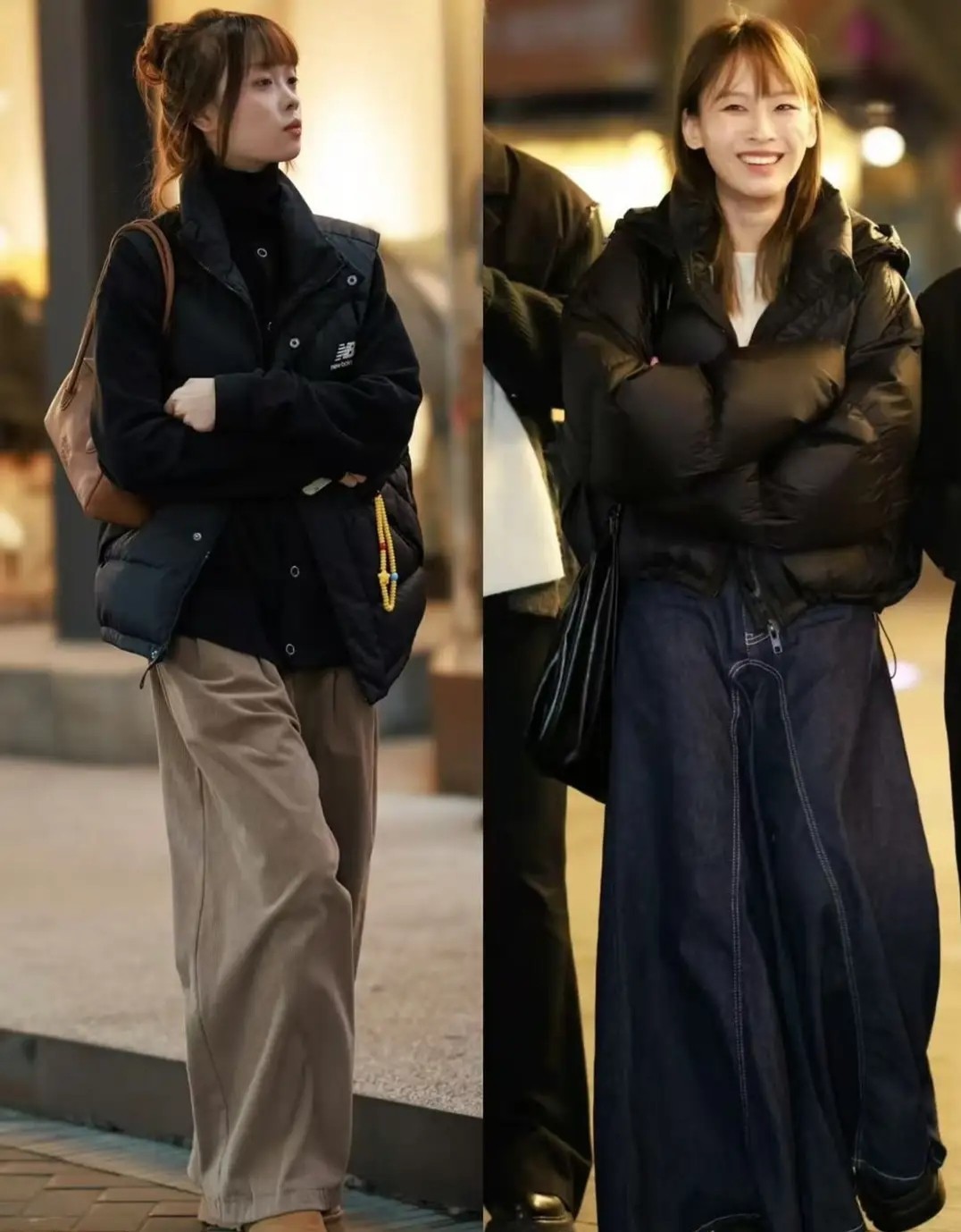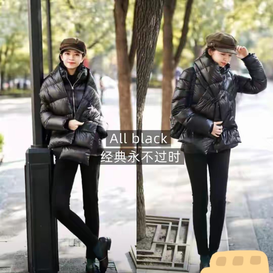 像下面右边这一件黑色羽绒服长度到膝盖的位置,整体效果就有点压身高。