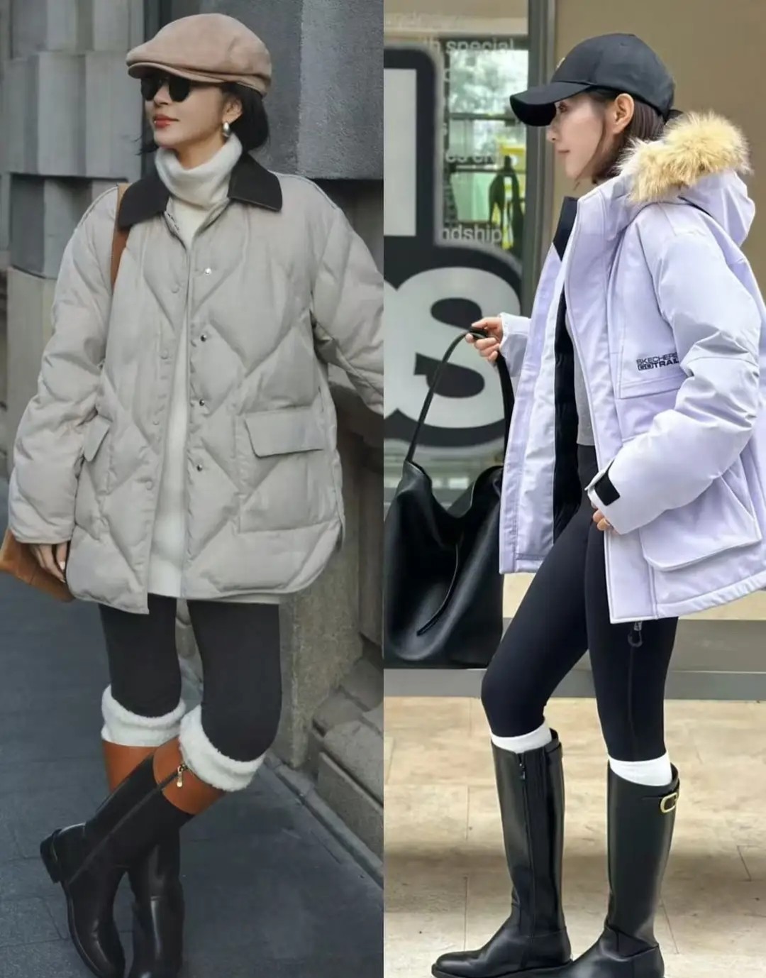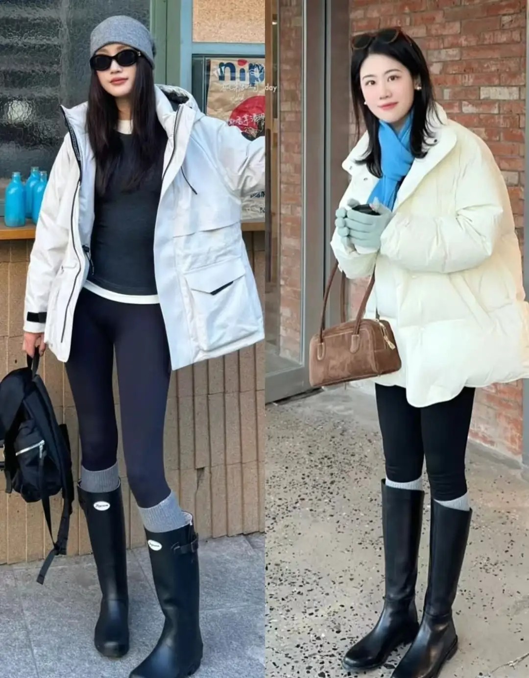 如果你想尝试穿无痕裤,这时候尽量做到选择最为纯色系或者是基础色的衣服来搭配,例如上面就用灰色羽绒服和白色羽绒服来搭配上无痕裤脚,穿一双黑色中筒靴,这样的穿搭出门不光保暖,而且很时尚。