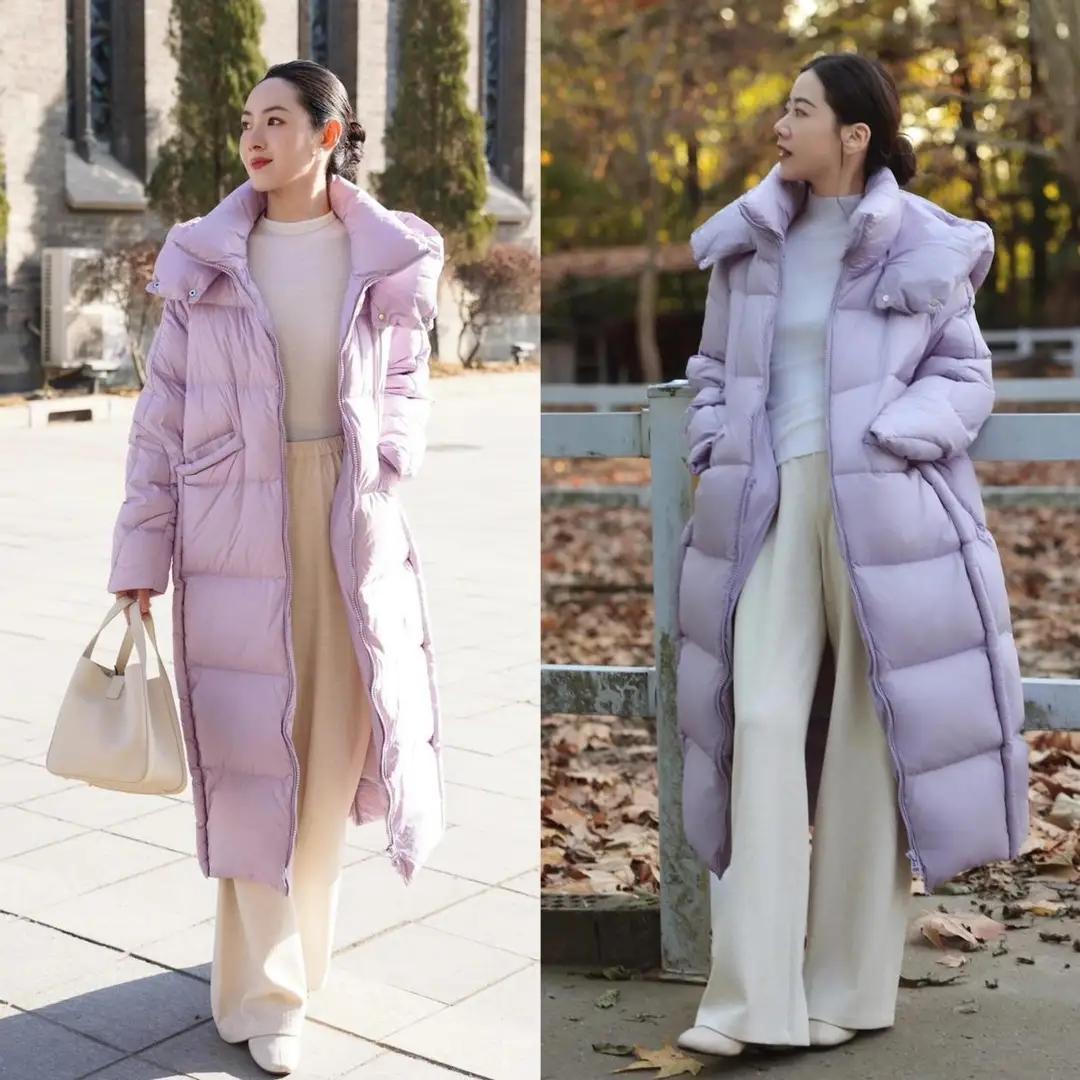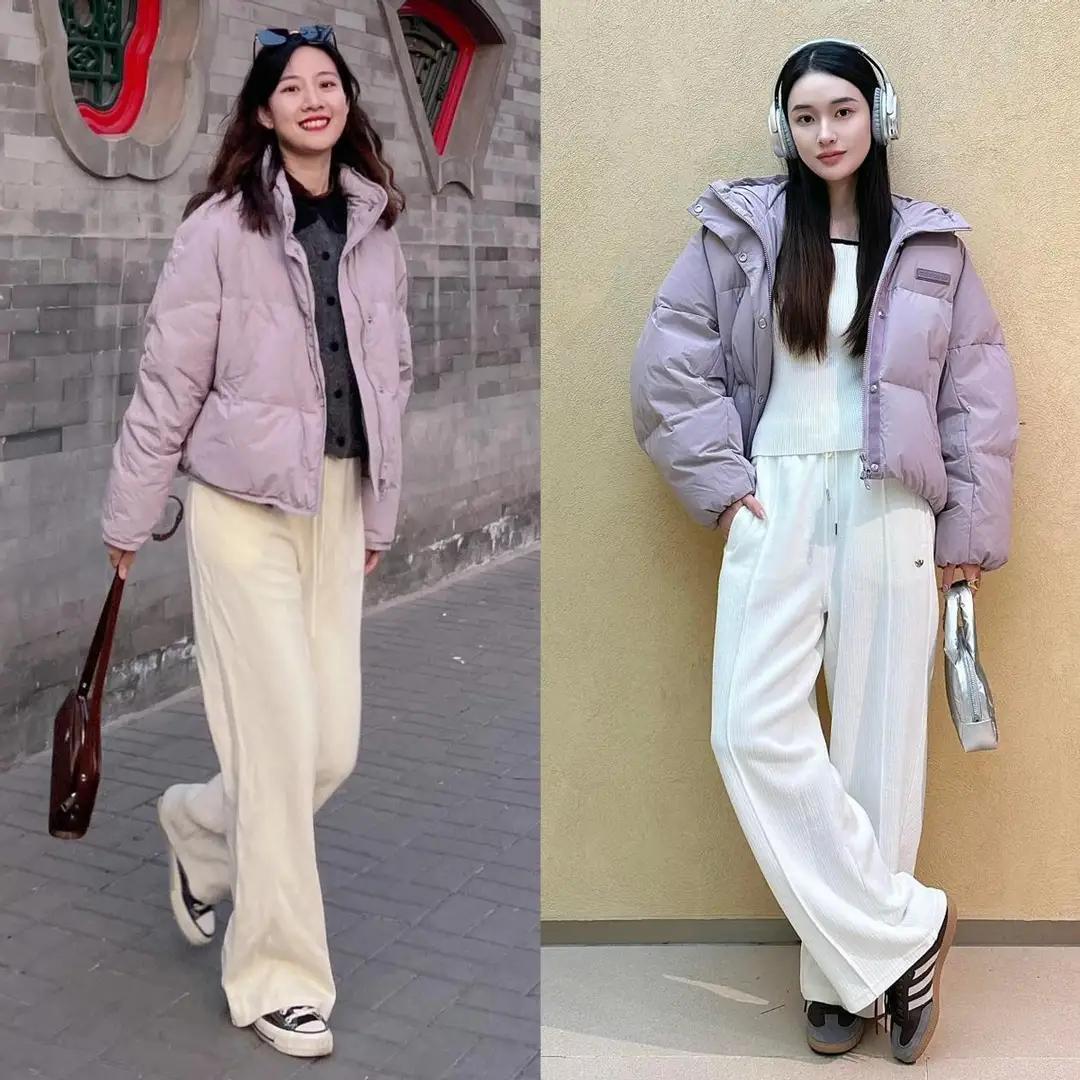 白色的裤子真的很百搭,而且像那些有点微胖的女性,就可以直接选择像下面这种白色的休闲阔腿裤,能够遮住胯宽腿粗这样的小缺陷,再加上长款的紫色羽绒服,保暖舒适又时尚。