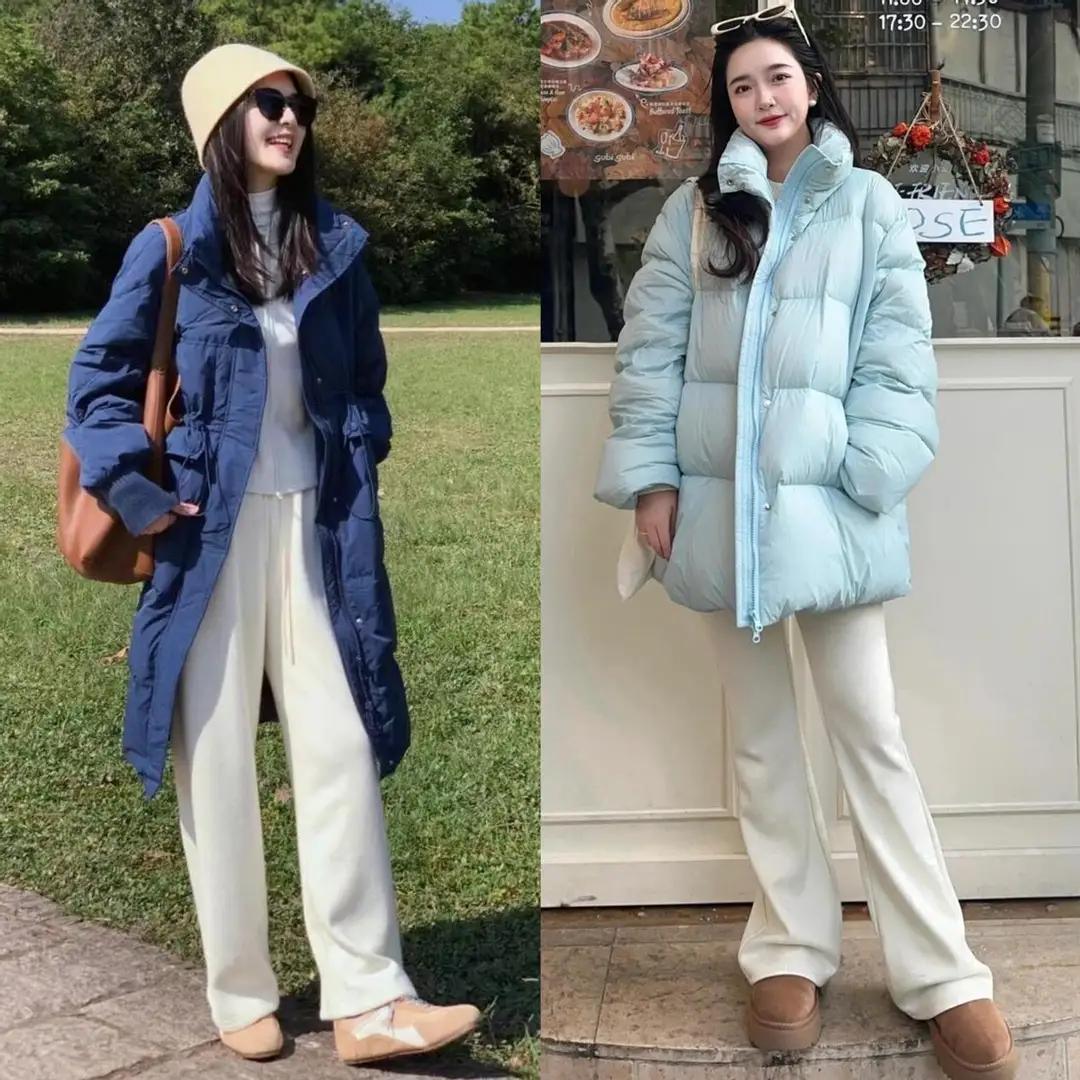 (三)羽绒服搭配小白裤①:长款羽绒服搭配白裤