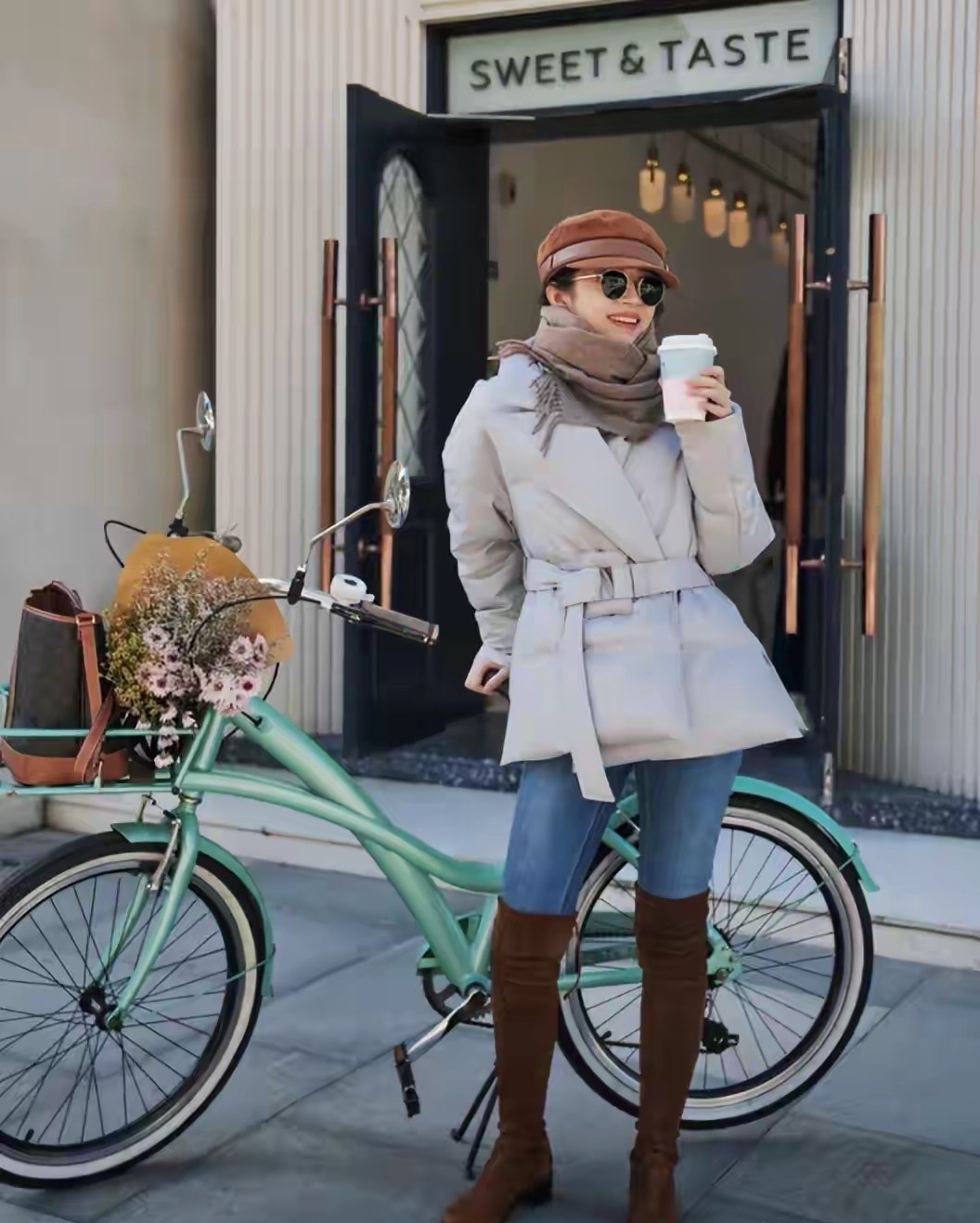 三木博主直接选择一件黑色羽绒服外套,内搭短款的黑色针织衫,加上一条高腰收腰款的小脚牛仔裤,脚穿黑色中筒靴,头戴一顶画家帽,轻松展现出她凹凸有致的身材比例,变得更加迷人。